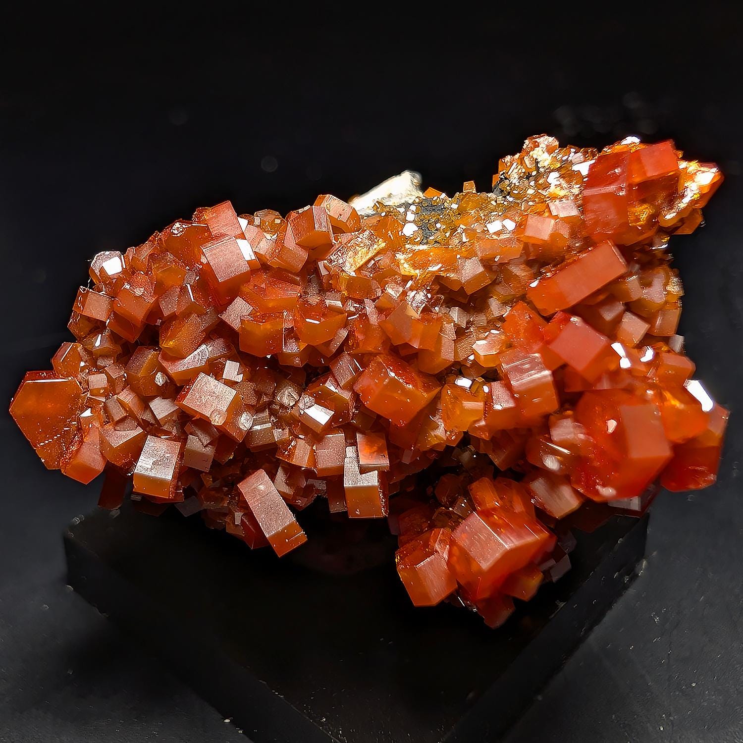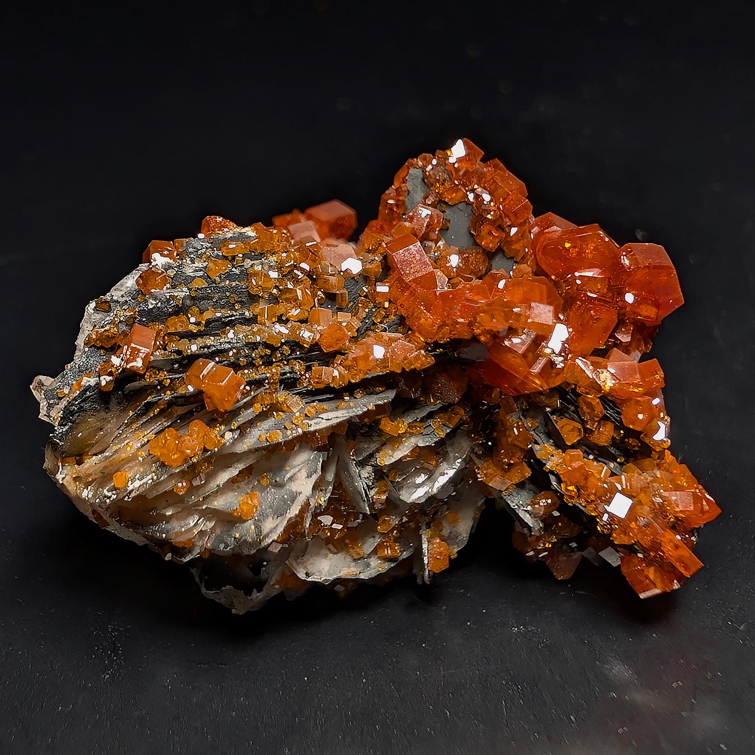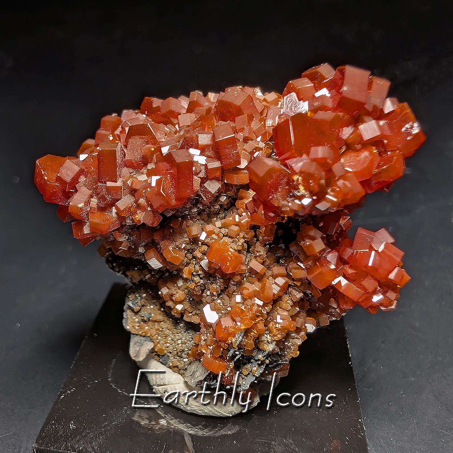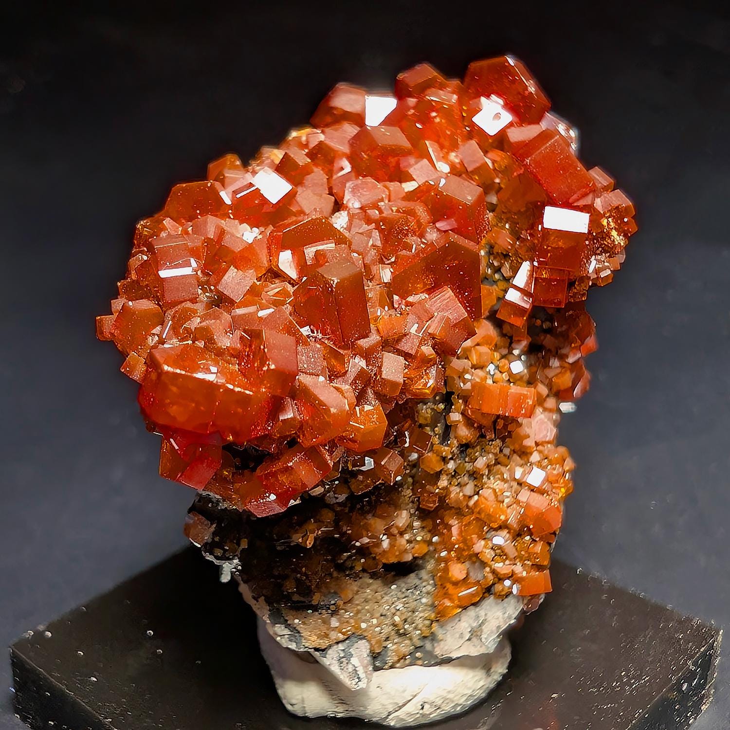 This small but gorgeous Vanadinite from Morocco shows off a fantastic display of perfect sparkling translucent red crystals clustered atop a nice Barite cluster formation. This is a bit larger than thumbnail and does not fit into a small perky box. It would be really nice mounted on a small base as the shape would be perfect for that.