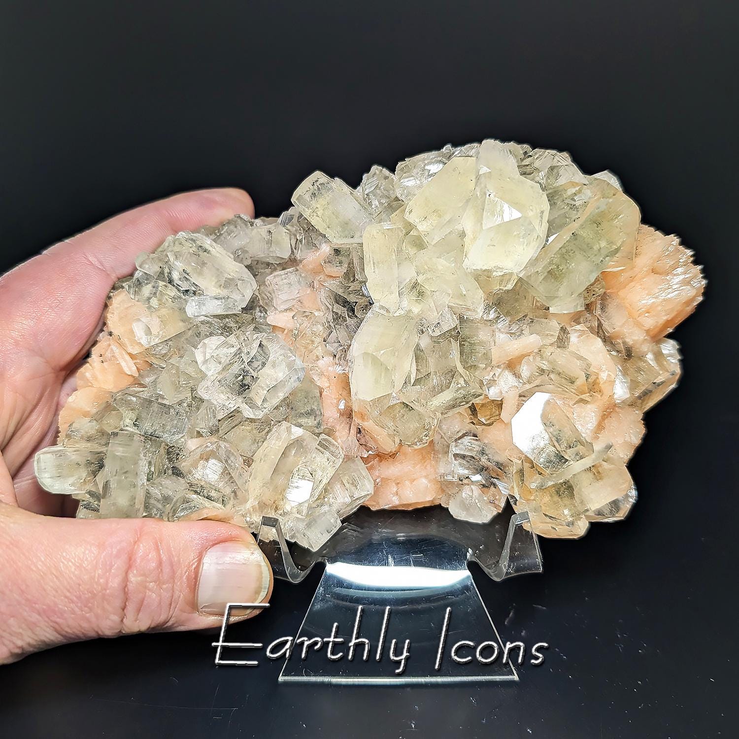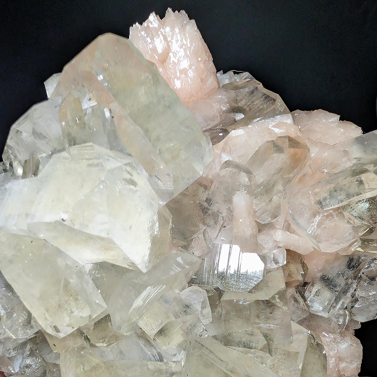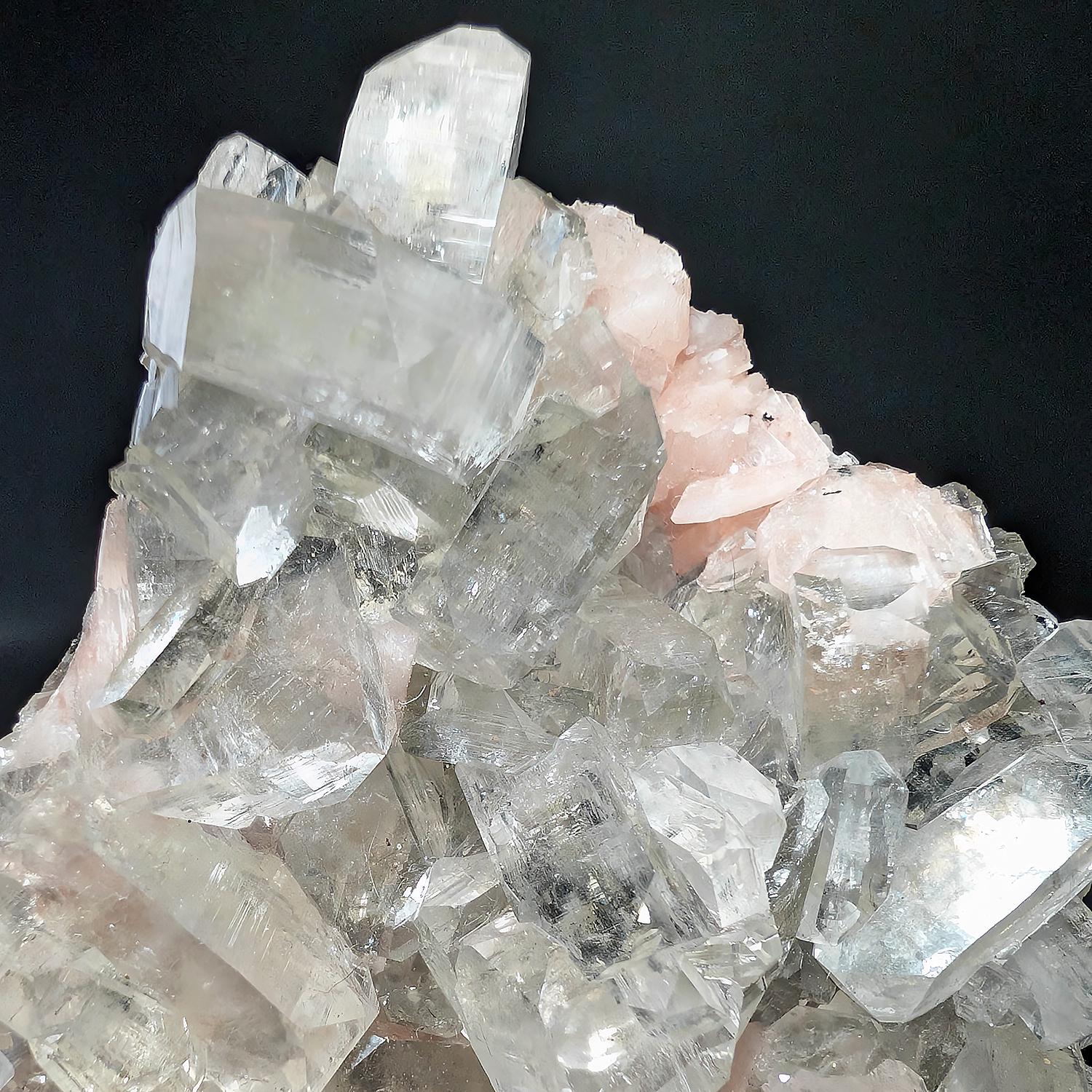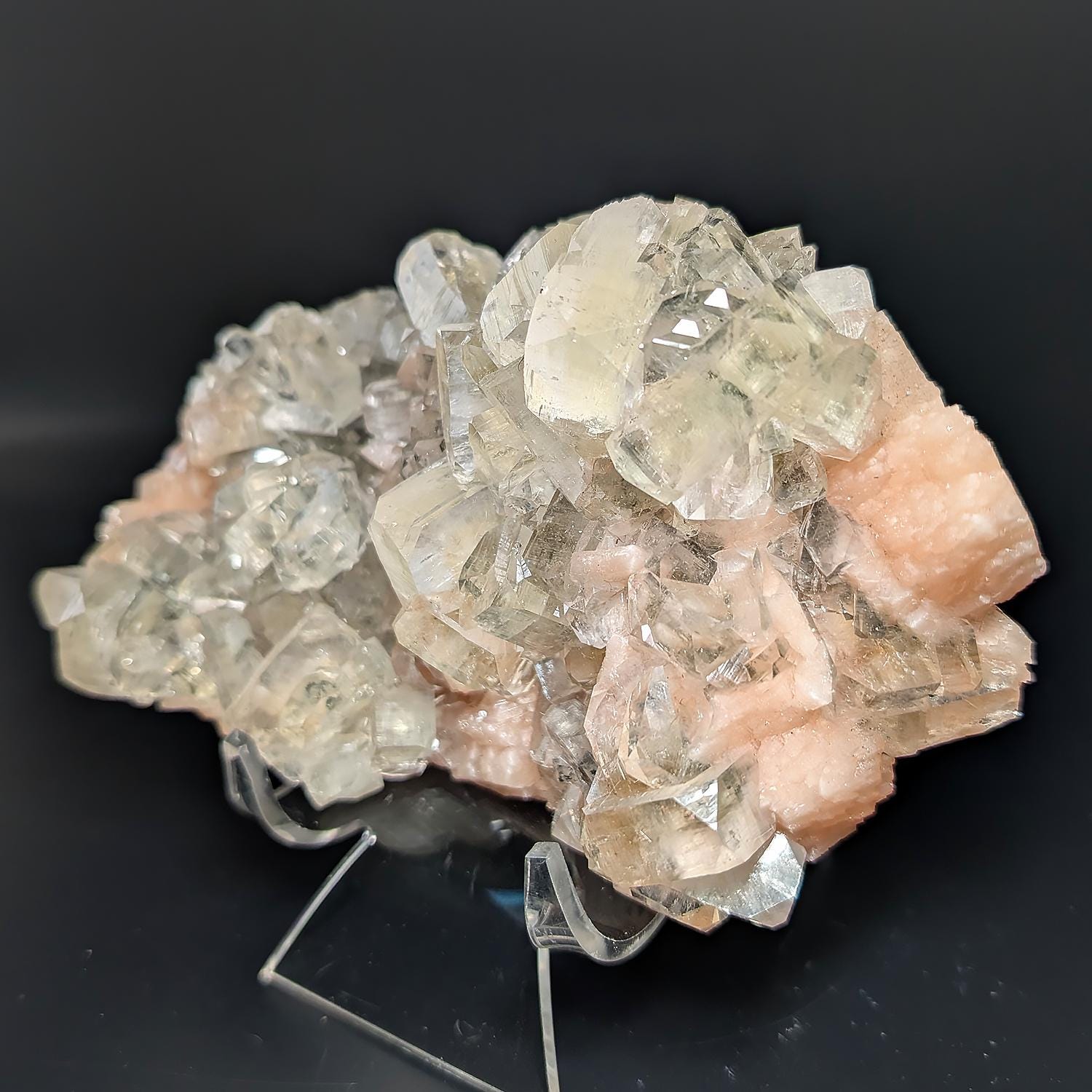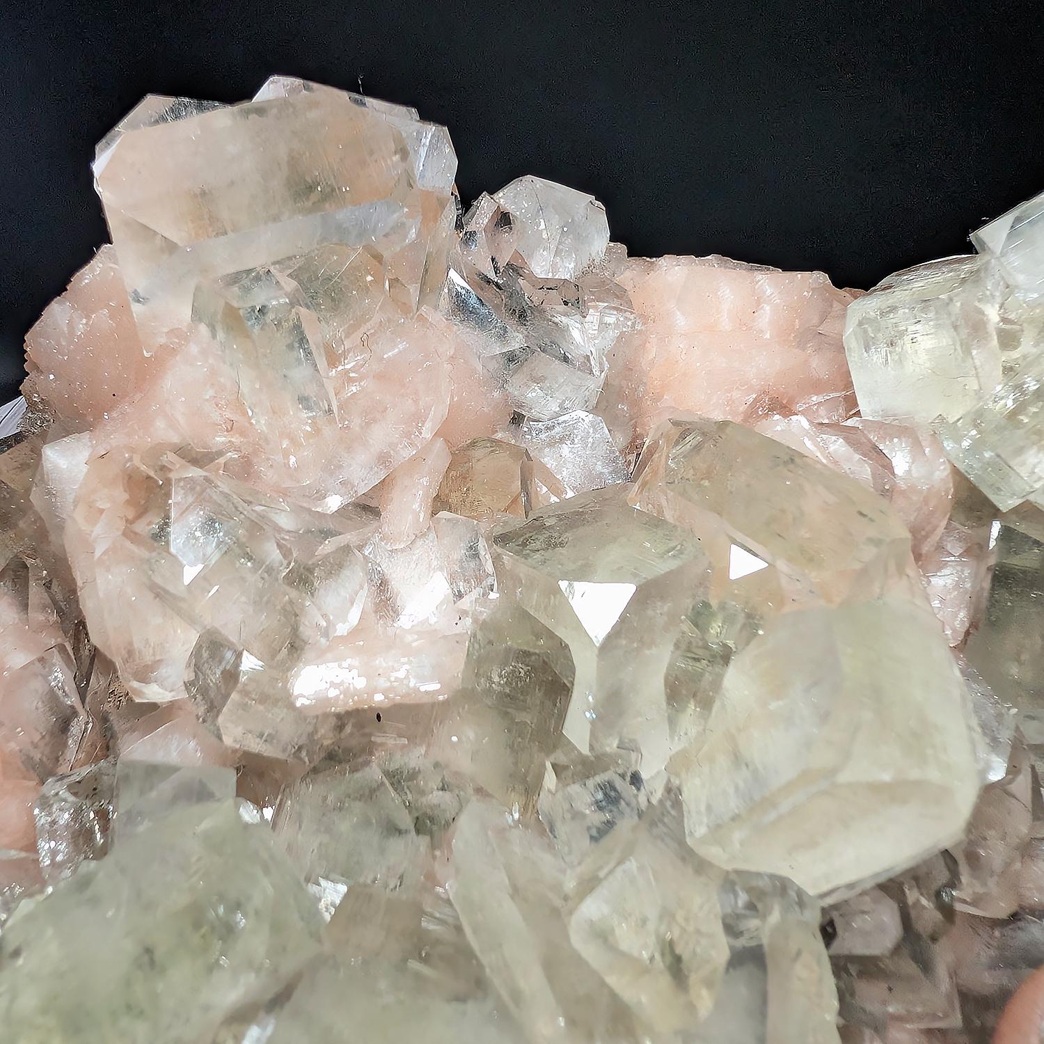 This large Zoesite specimen is from India and displays beautifully, with glassy sparkling crystals of Apopyhyllite sitting upon a bed of saturated peachy pink Stilbite crystals, with more colorful Stilbite on the back. A great piece that will shine on any shelf or as a decorator display piece for a table or cabinet.
