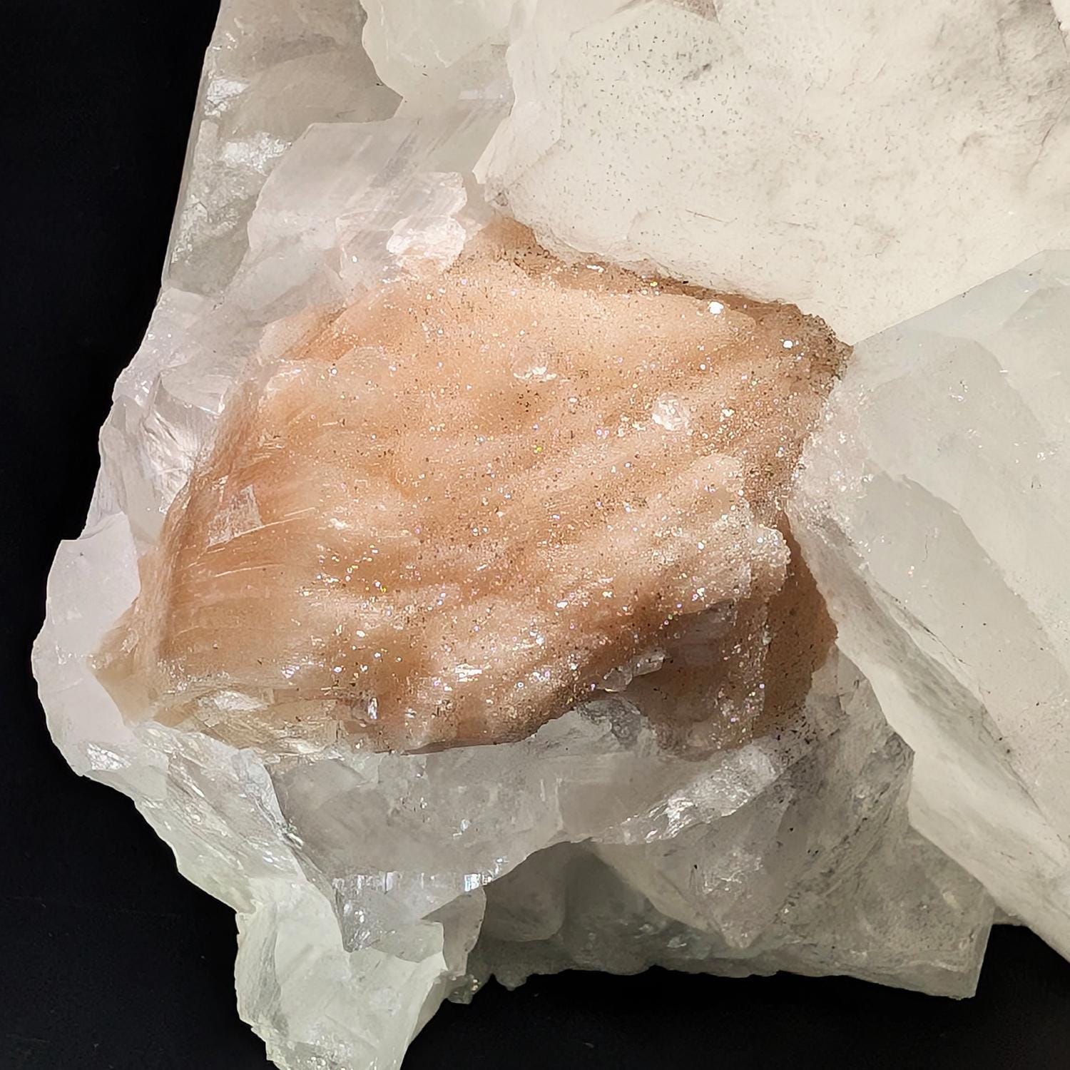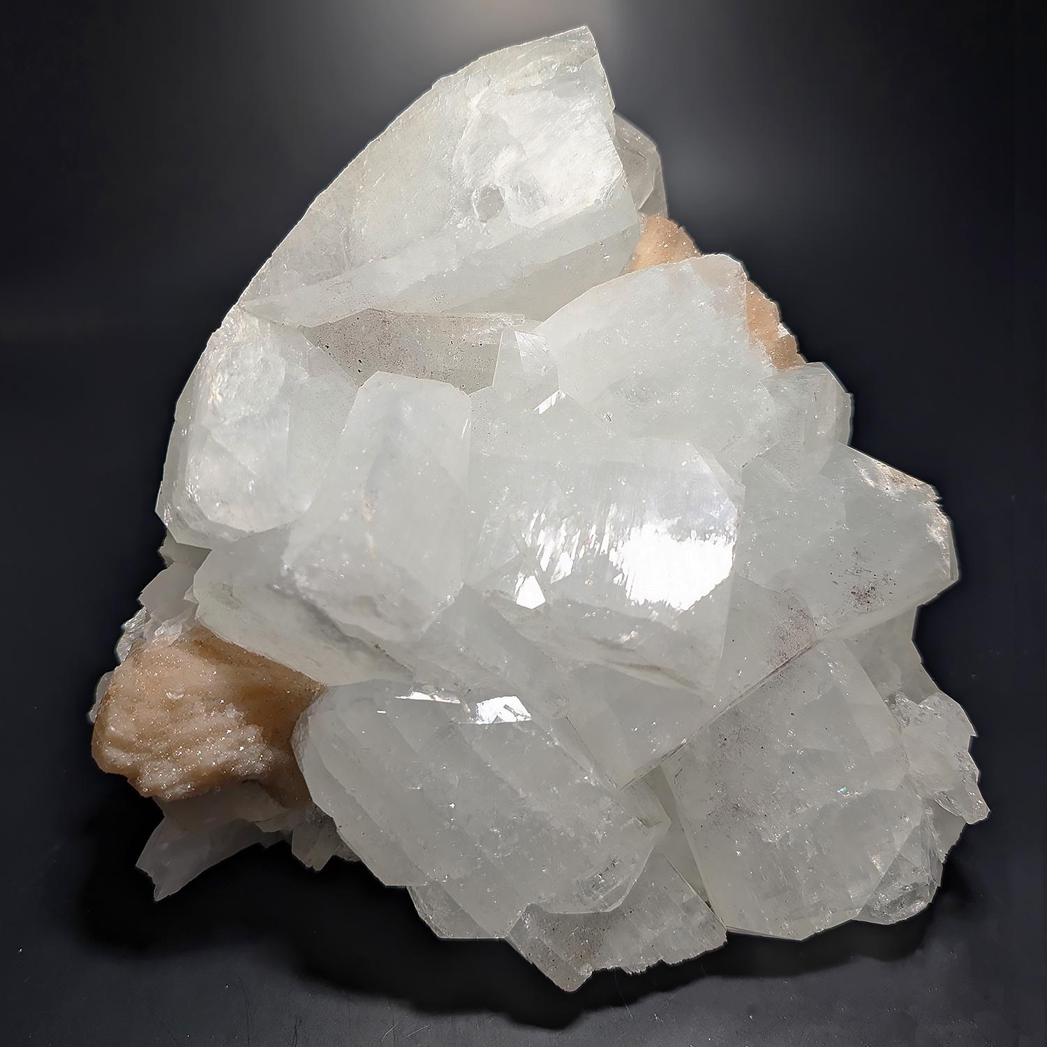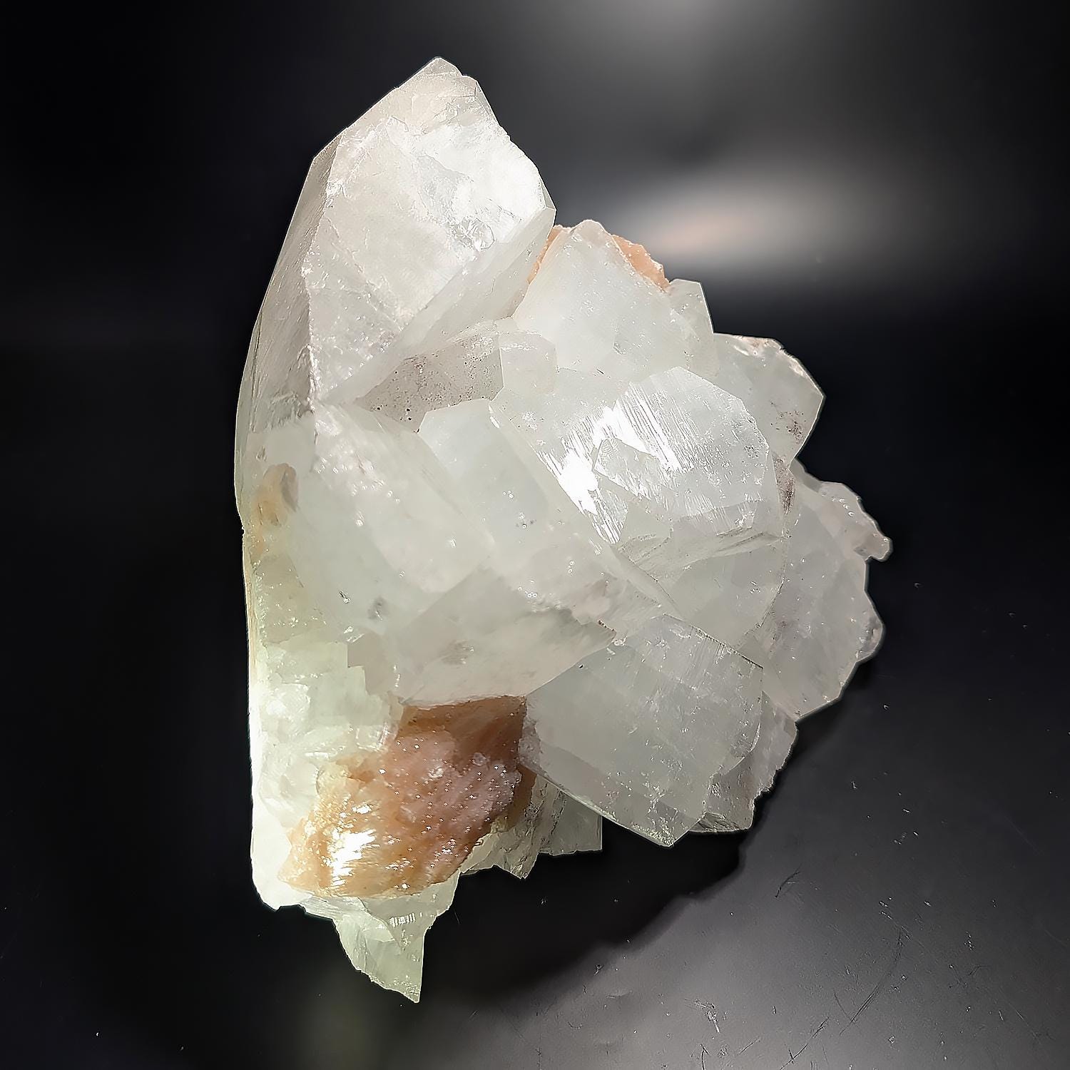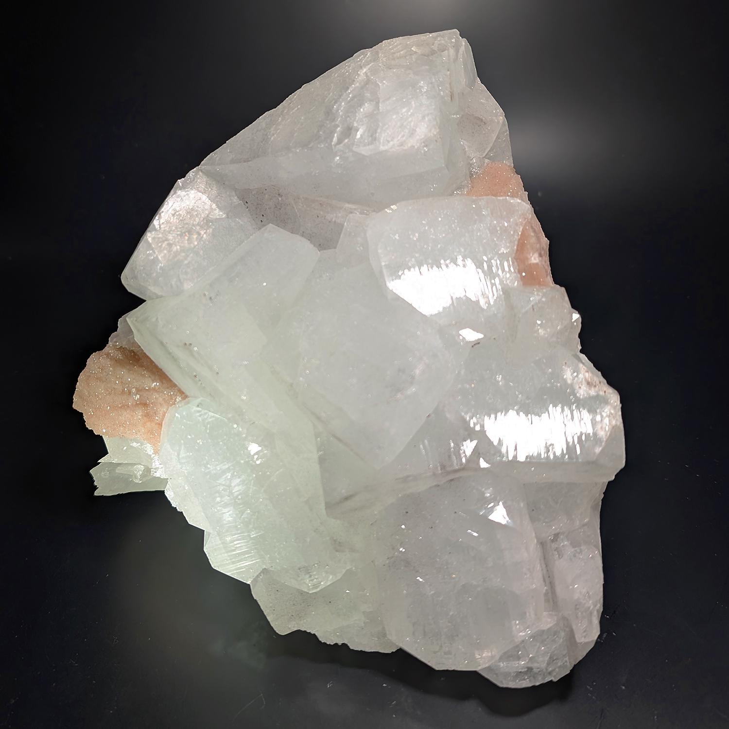 This large specimen, over 8 lbs, is from India and displays beautifully, with very large gorgeous sparkling crystals of Apopyhyllite with incredible luster accompanied by peachy-pink Stilbite. A bold piece that will impress in any display cabinet or as a decorator display piece for a table or shelf!