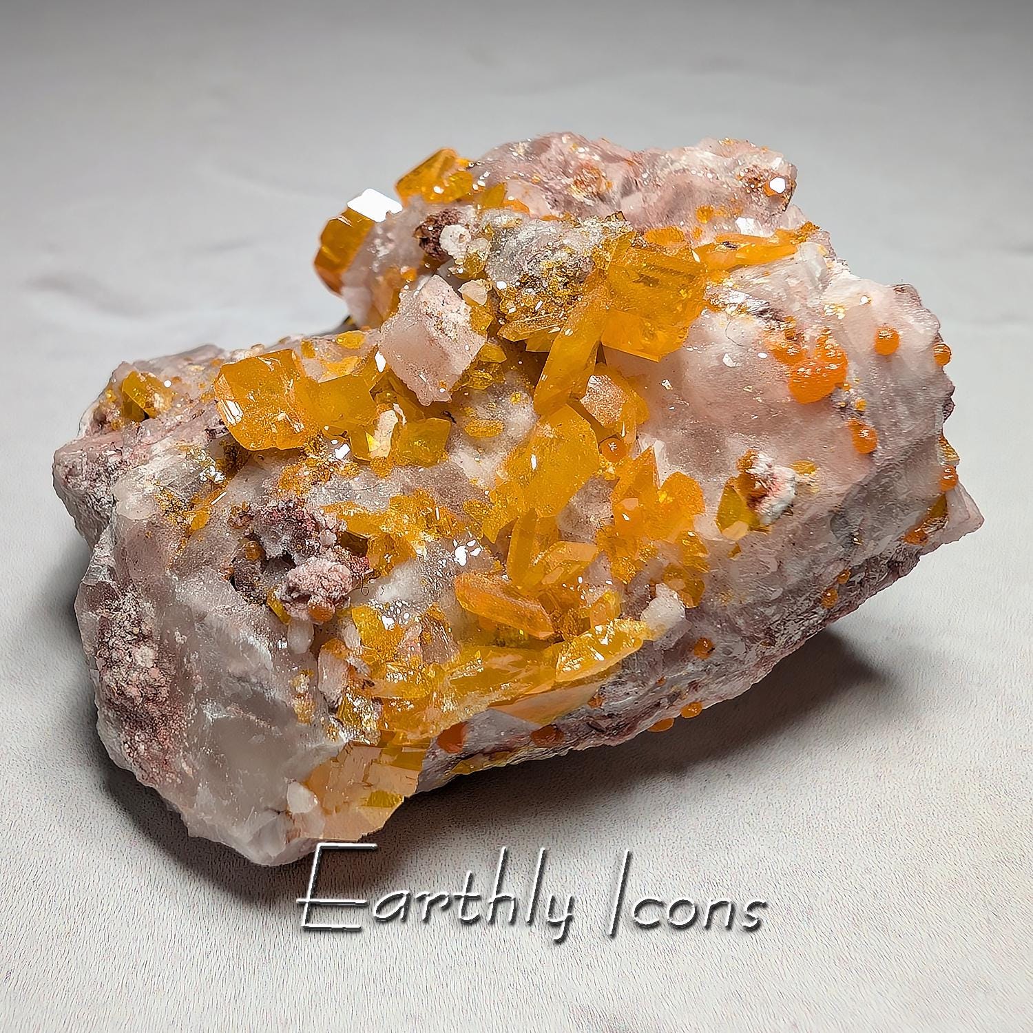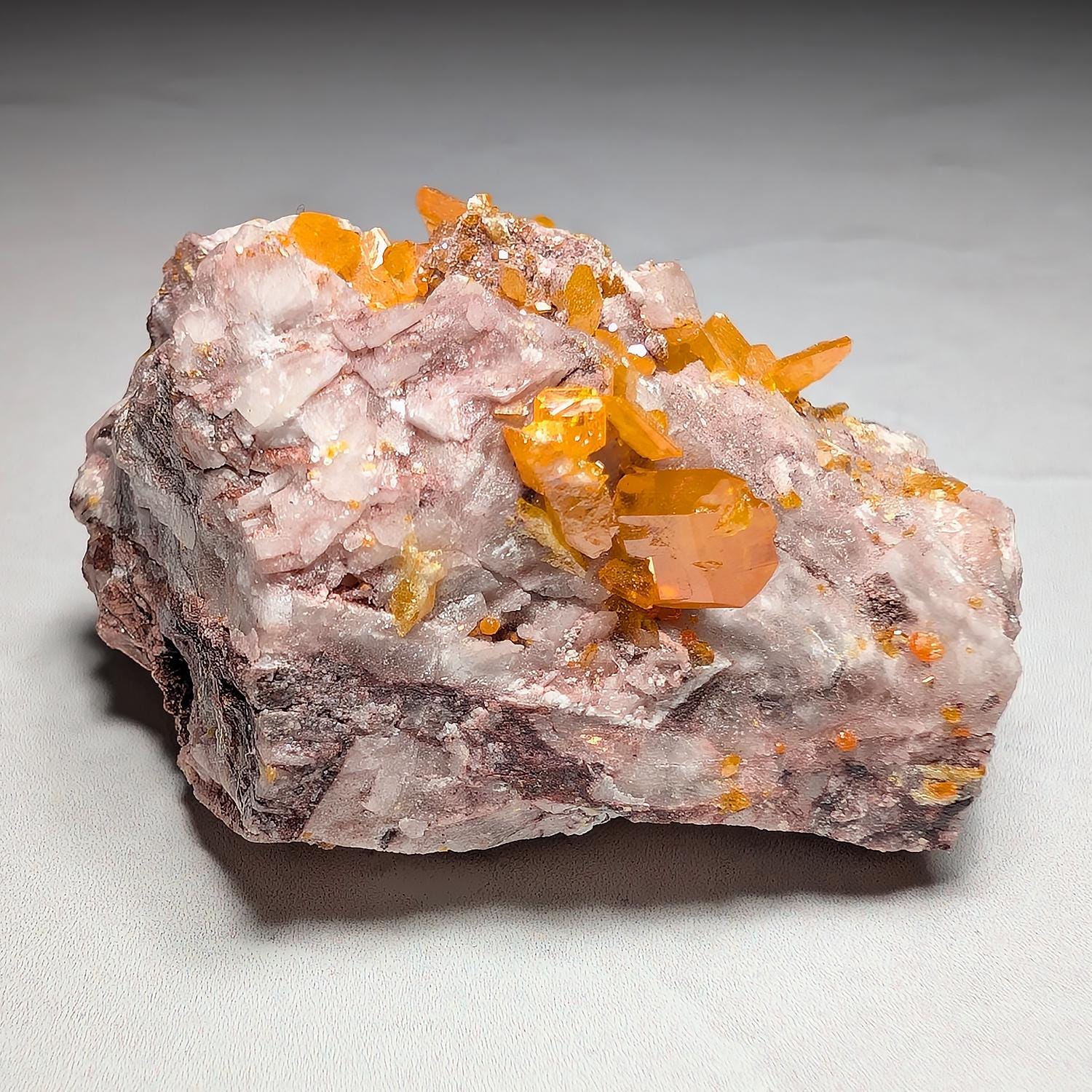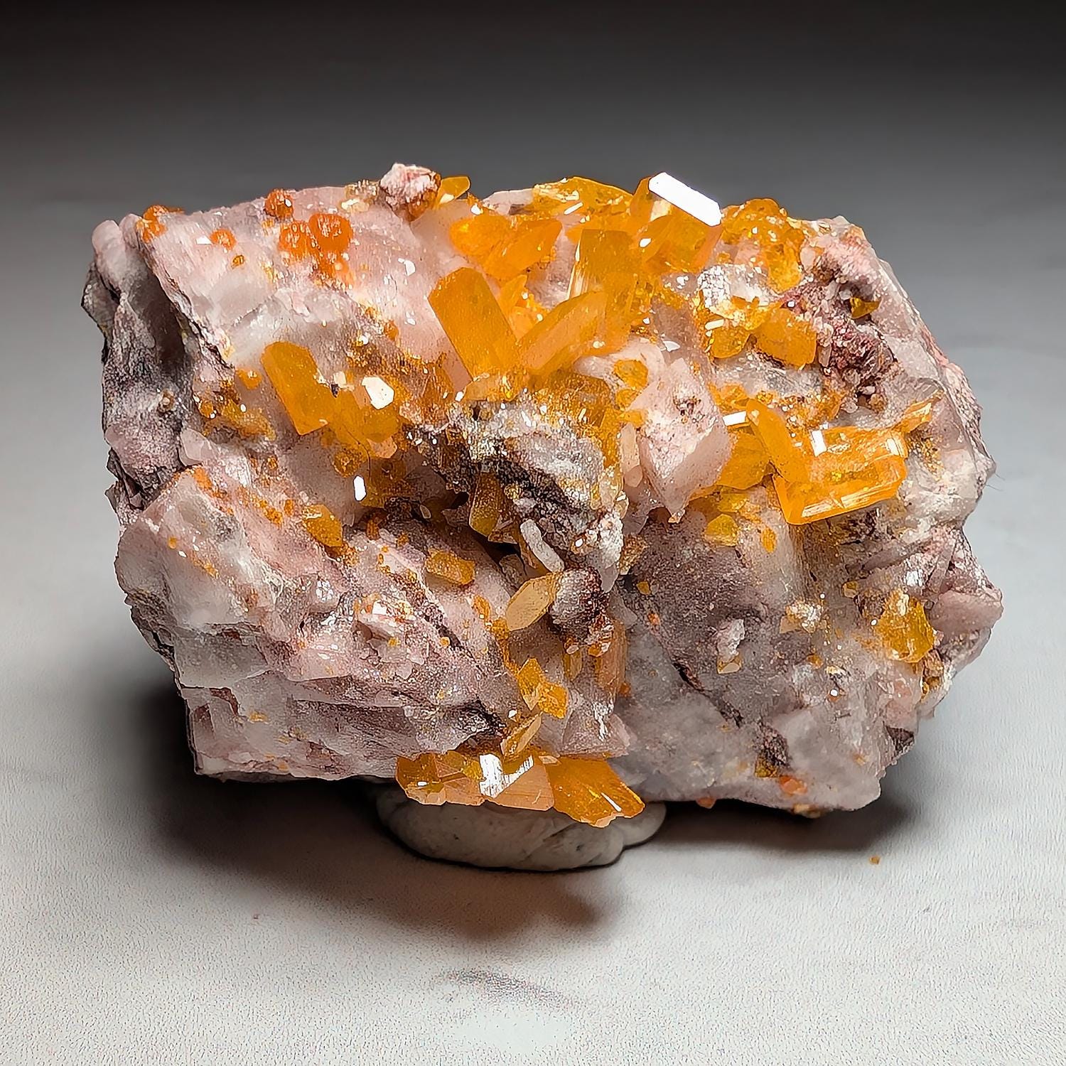 This stellar specimen of Wulfenite crystals from the famed Rowley Mine in Arizona is full of spectacular juicy translucent orange Wulfenite crystals along with rich fanta orange Mimetite sprinkled on the matrix in places. This is an outstanding example of Rowley Mine Wulfenite which would be a star in any collector's arsenal.