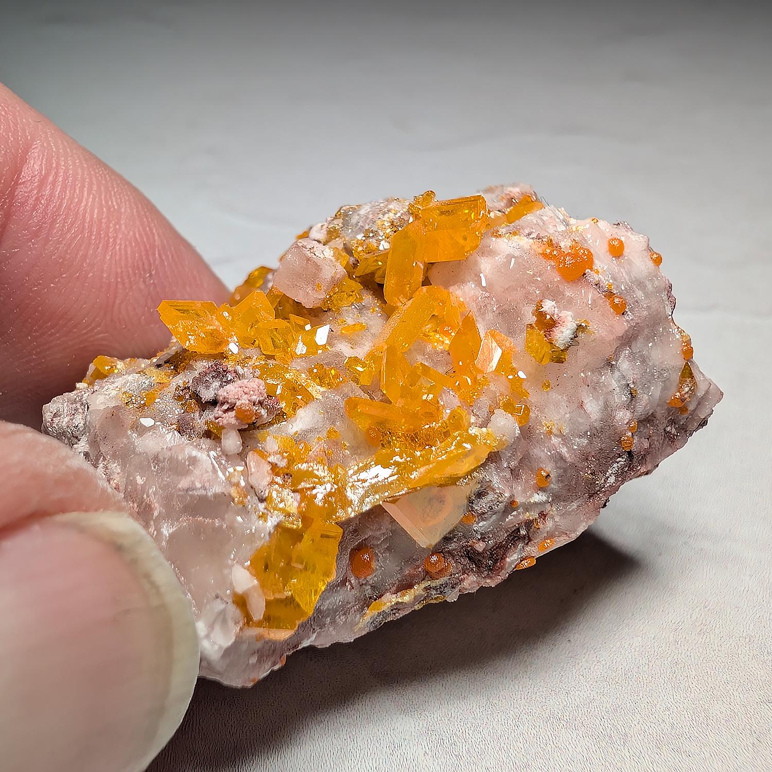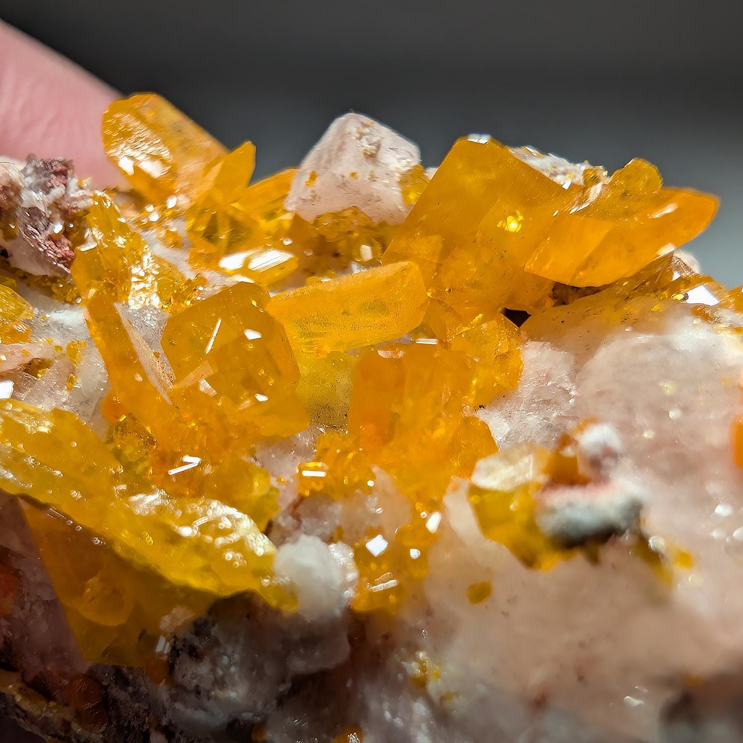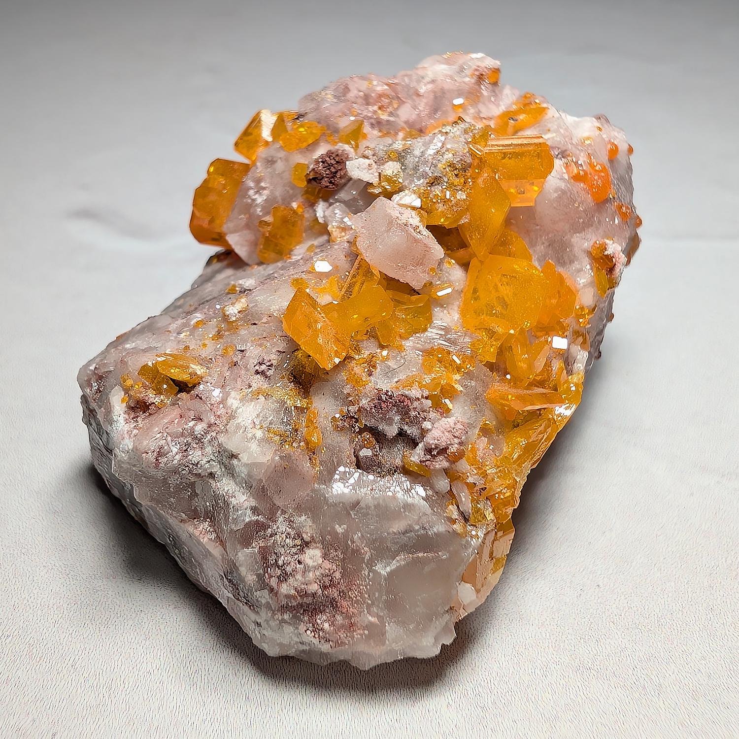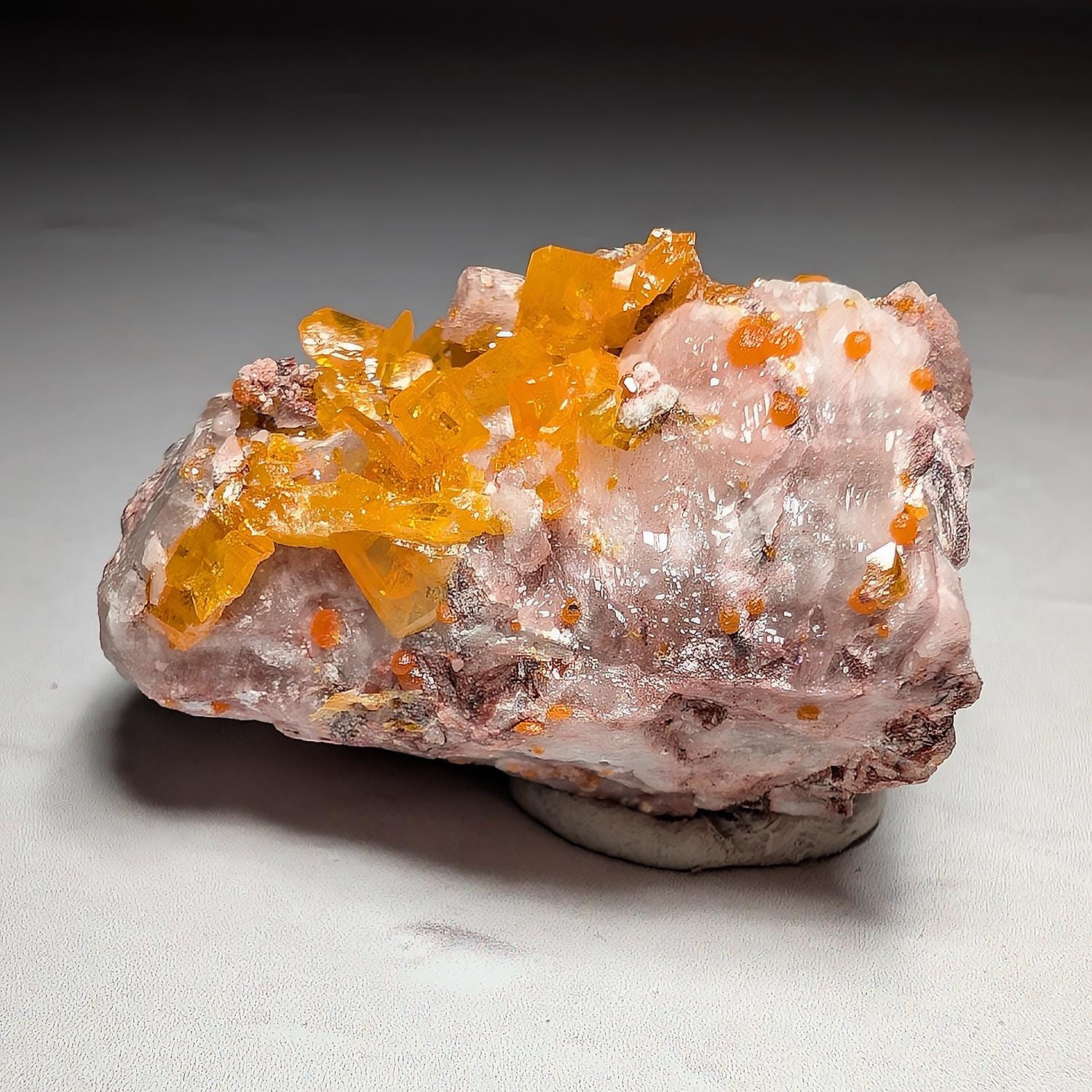 This stellar specimen of Wulfenite crystals from the famed Rowley Mine in Arizona is full of spectacular juicy translucent orange Wulfenite crystals along with rich fanta orange Mimetite sprinkled on the matrix in places. This is an outstanding example of Rowley Mine Wulfenite which would be a star in any collector's arsenal.