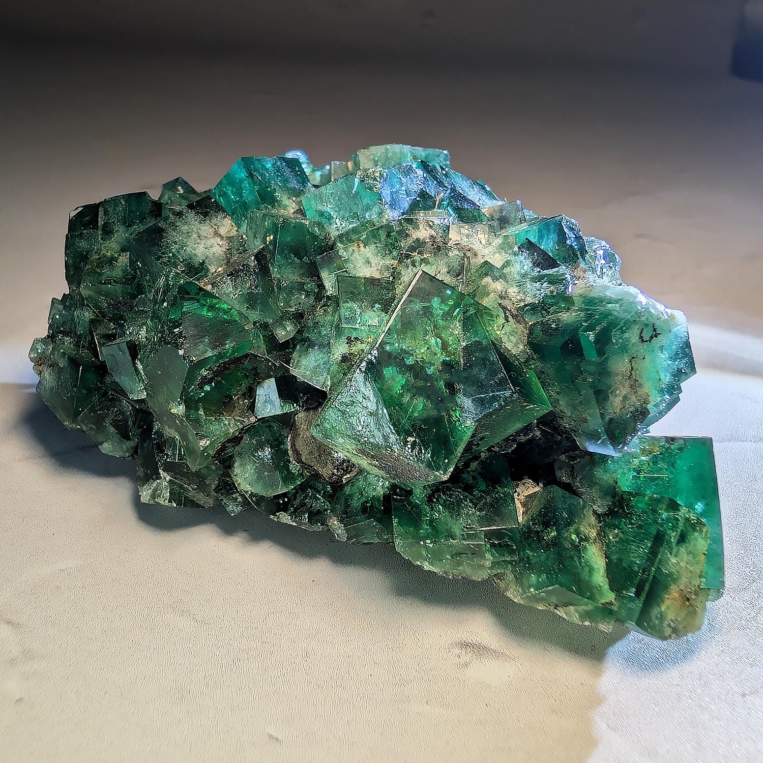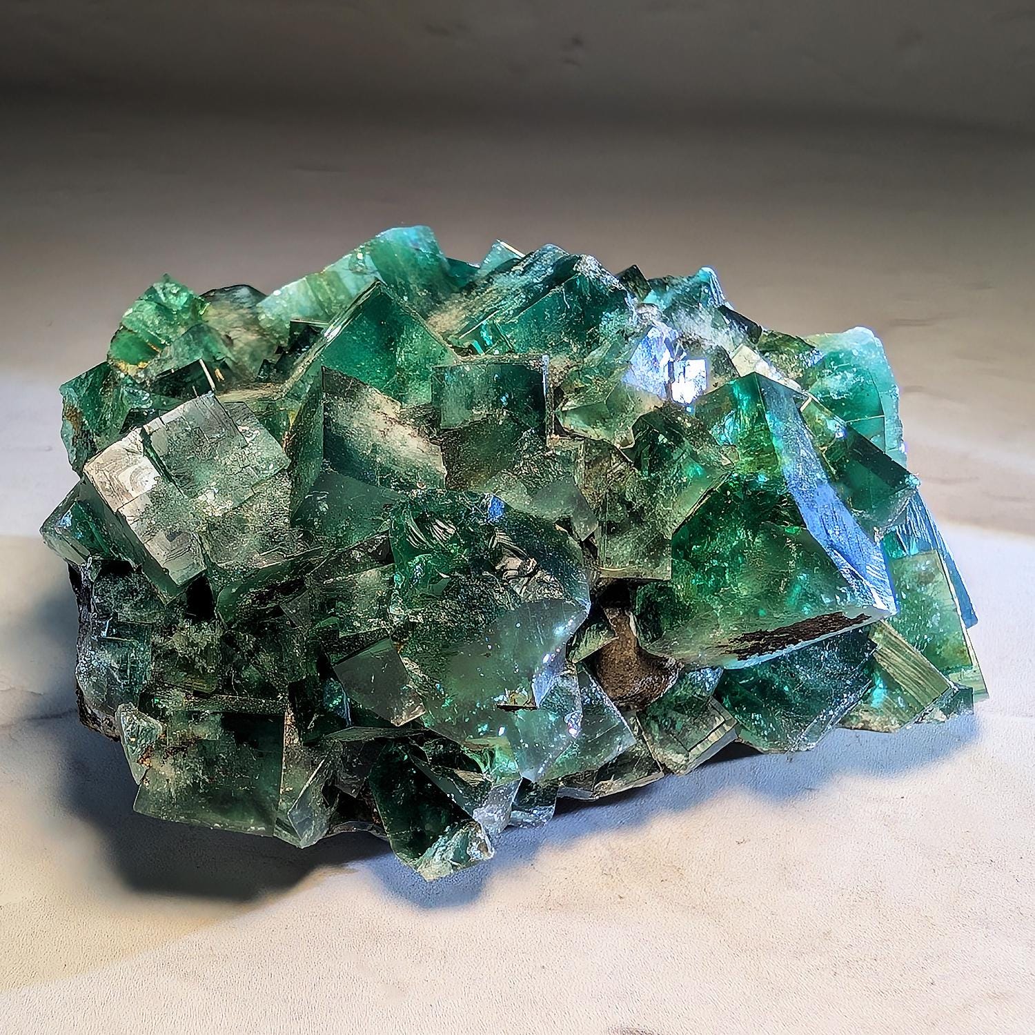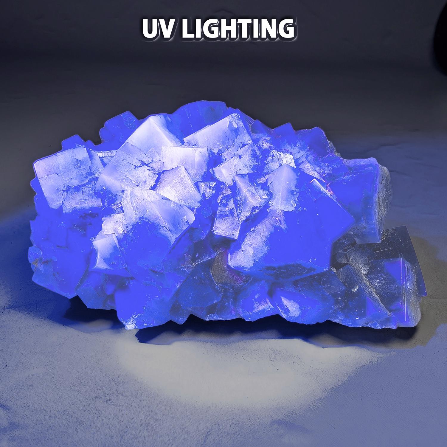 This astounding specimen shows off beautiful Fluorite cubes of vibrant glassy green, which fluoresce a bright blue under UV lighting. This specimen comes out of the incomparable Hidden Forest Pocket from the famed Diana Maria Mine in County Durham, England.