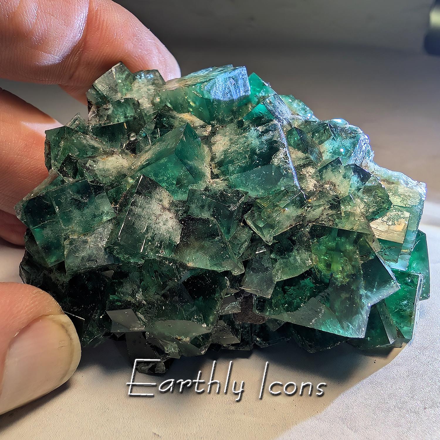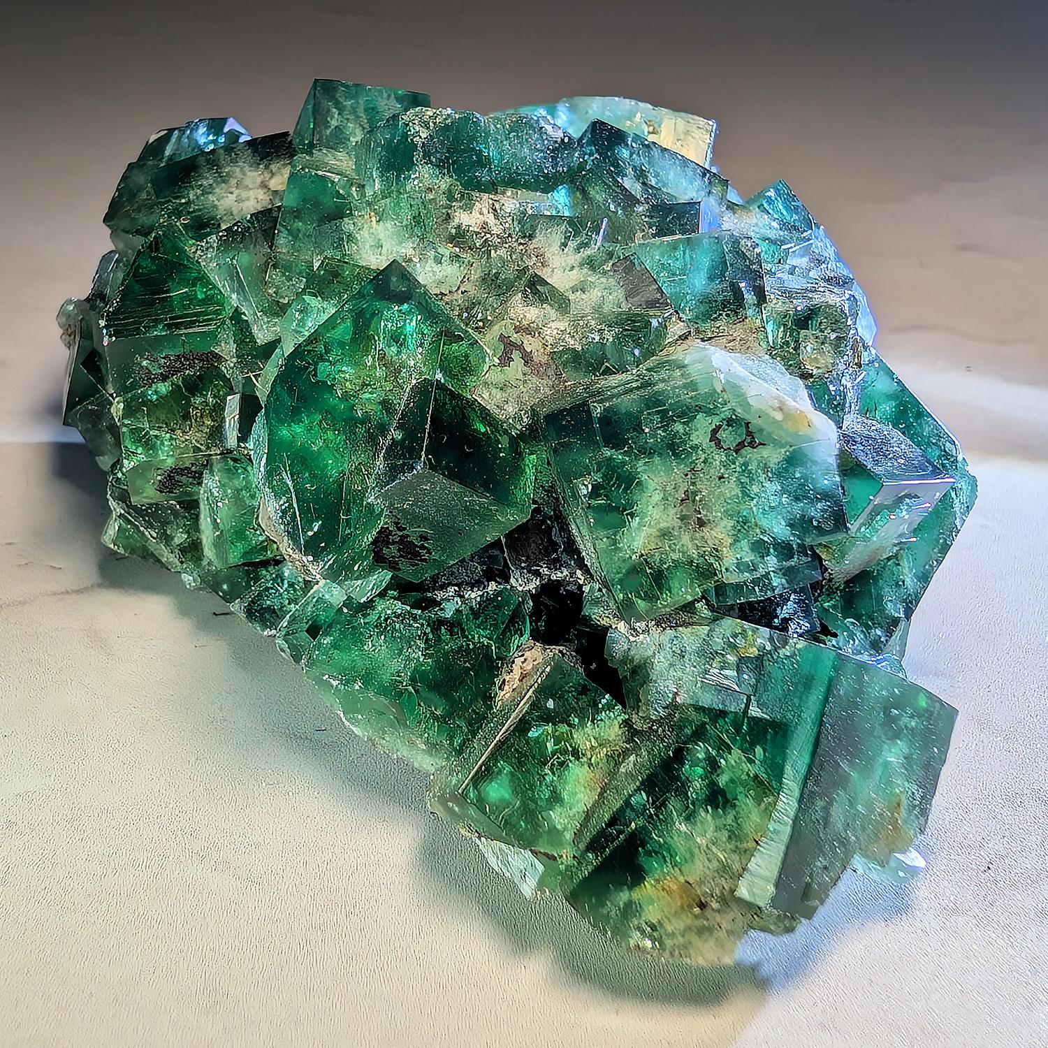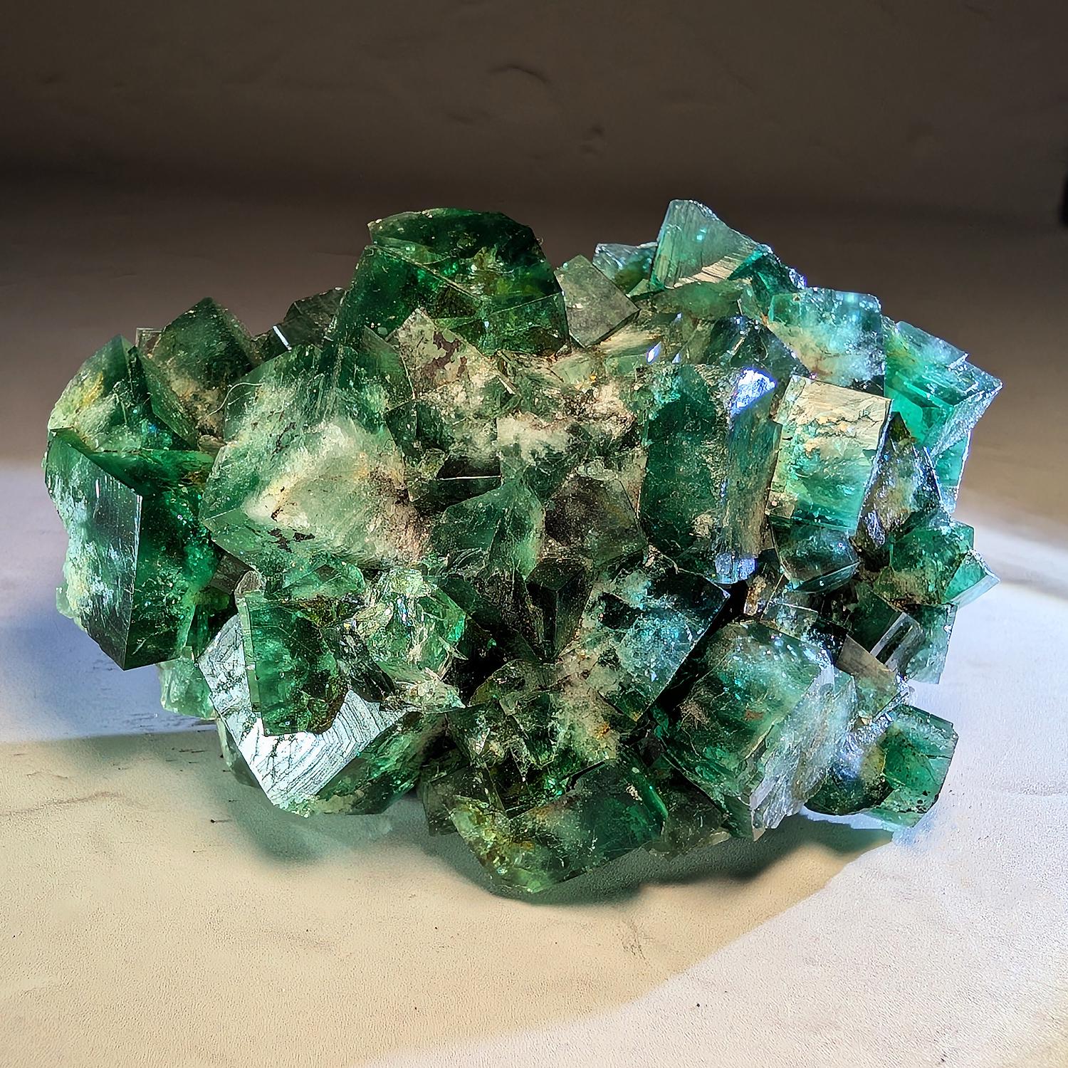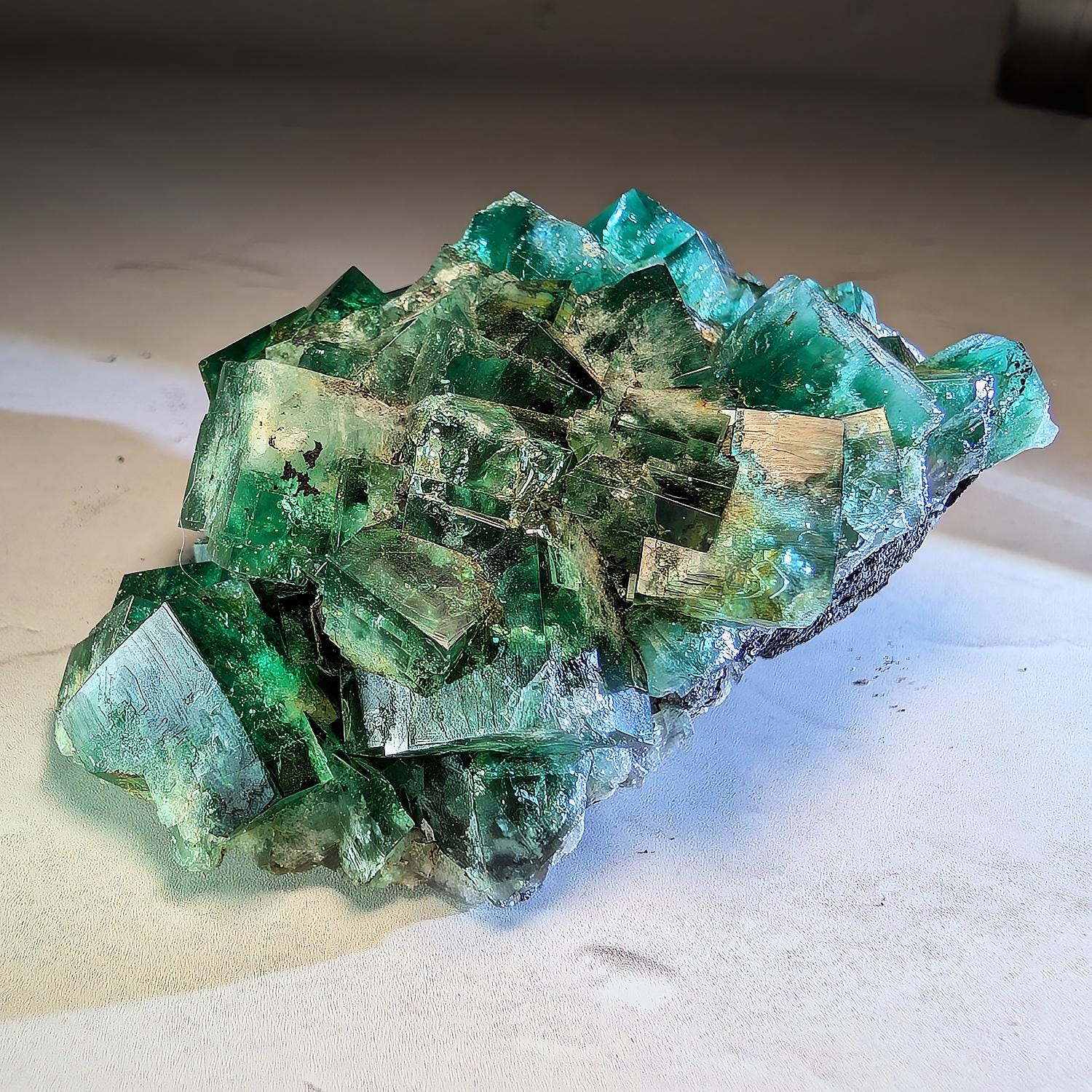This astounding specimen shows off beautiful Fluorite cubes of vibrant glassy green, which fluoresce a bright blue under UV lighting. This specimen comes out of the incomparable Hidden Forest Pocket from the famed Diana Maria Mine in County Durham, England.